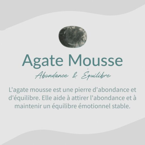 Moss agate is associated with the forces of nature and encourages personal growth and self-confidence. It inspires a sense of renewal and rejuvenation, helping to overcome fears and move forward with confidence. It is also a stone of abundance that attracts prosperity and fosters a positive mindset.